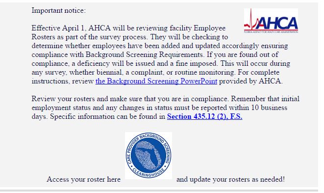 ALF Boss has learned that AHCA has sent out a memo to all of Florida’s assisted living facilities informing them that they will now be checking and looking at your Background Screening Facility Roster when they come out to your facility.